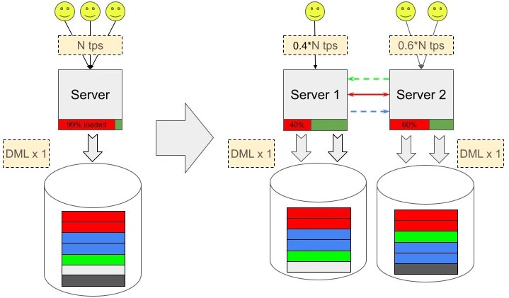 It's important to remember that active-active replication in PostgreSQL is currently only feasible with logical replication, which denotes network latency and additional server load from decoding, walsender, and so on. Network latency also immediately arises - we need to wait for confirmation from the remote node that the transaction was successfully applied, right? Therefore, the idea of scaling the write load for the general case of 100% replication immediately encounters the fact that each server will be required to write not only its own changes, but also changes from other instances (see the figure above). That isn't a problem for massive queries with bushy SELECTs, but a multi-master query is more likely to be used by clients with pure OLTP and very simple DML.
