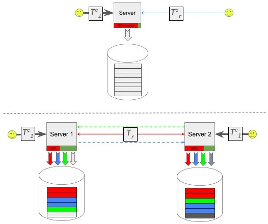 Drawing from my experience in rocket science, I've developed the habit of qualitatively evaluating the effects of the phenomena being studied beforehand. Let's estimate the percentage of the database that can be replicated in active-active mode without potentially degrading performance. For simplicity, let's assume there are two company branches located on different continents, and consider the following configuration options: (1) one server, or (2) two servers operating in multi-master mode, where access will always be local (as illustrated in the figure below).
