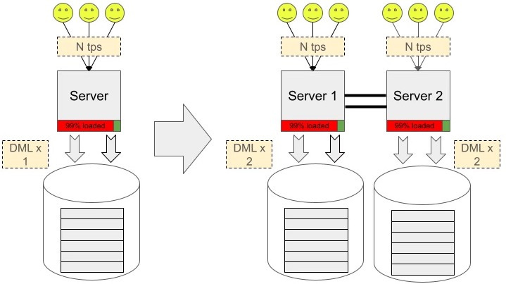 Typically, clients consider a multi-master solution when they hit a limit in connection counts for their OLTP workloads. They often have a large number of clients, an N transaction-per-second (TPS) workload, and a single database. They envision a solution that involves adding another identical server, setting up active-active replication, and doubling their workload.