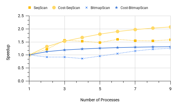 So maybe SeqScan should have been used on a small number of workers, too? Let's see how the scanning operation is accelerated separately for BitmapScan and SeqScan, and also watch how the costs of the scanning nodes change (in relative values):